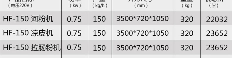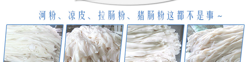 名稱SZ-HF-150高效節能河粉機 電(diàn)源220/380V 功率0.75/41kw 產量60/90/120/150kg/h 尺寸主機尺寸3500*720*1050mm 外形(xíng)尺寸3600*920*1500mm 重量320kg 規格粉條(tiáo)寬度mm:4/6/8/10 其他
